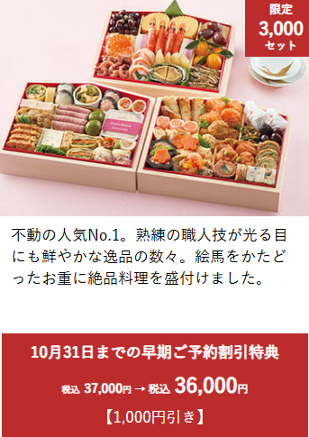 人気のおせち「絵馬」で1,000円引きの36,000円になります。