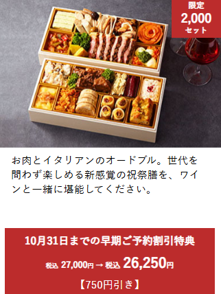 「買おうと思ったらもう売り切れ…」ということを避けるためにも、 気になるおせちは早めの予約がおトクです。